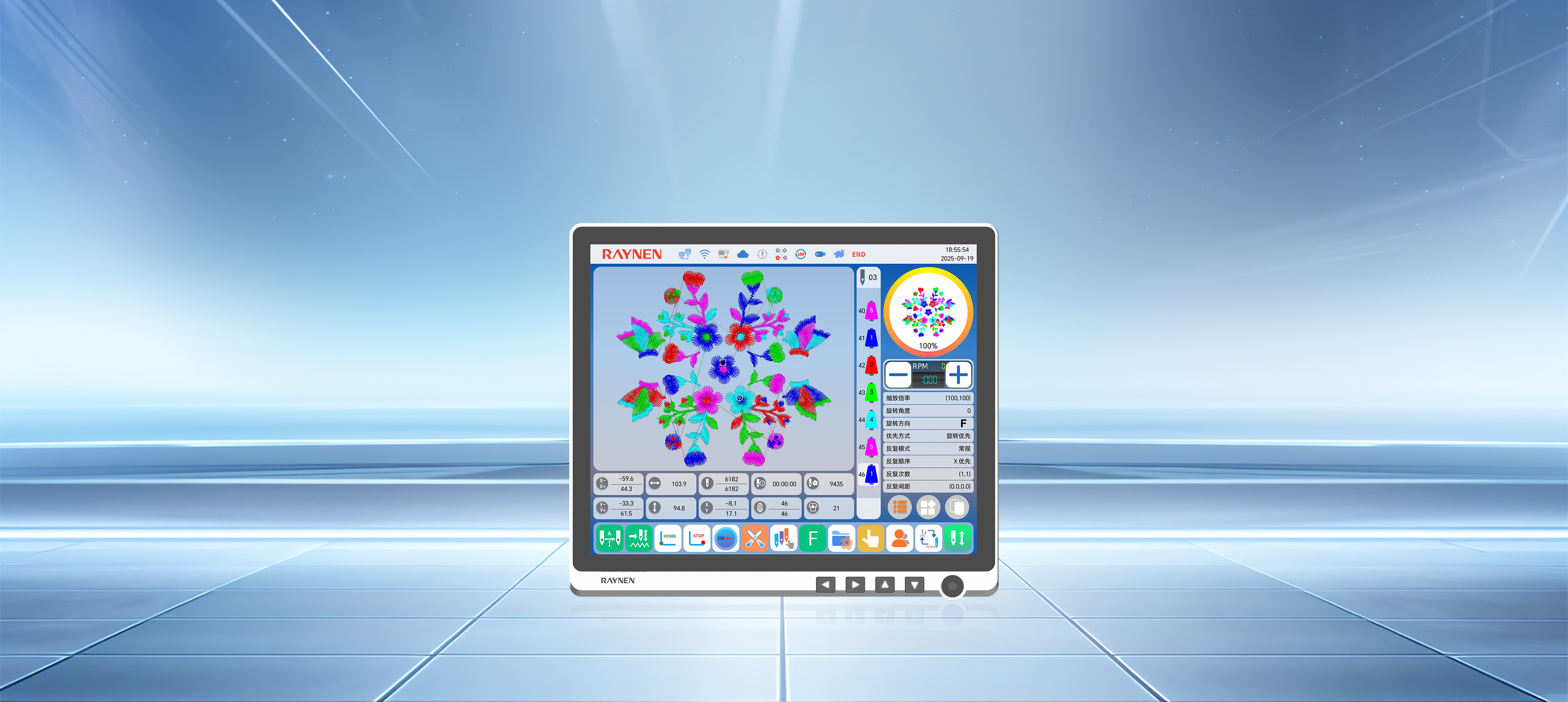 S700系列刺繡機電控系統通過緊湊的機身設計、標準化部件應用,提升了空間利用率和設備維護便捷性,降低了運營成本。其無線操作屏、高精度絕對值編碼器伺服控制系統、全新通用專機伺服等技術創新,不僅提高了生產效率和產品質量,還通過移框智能防夾設計、安全光幕和高清顯示屏增強了設備的安全性和操作性。同時,配置了智慧工廠網絡管理接口,實現了設備的遠程智能化管理,并在精度控制上達到行業領先水平。