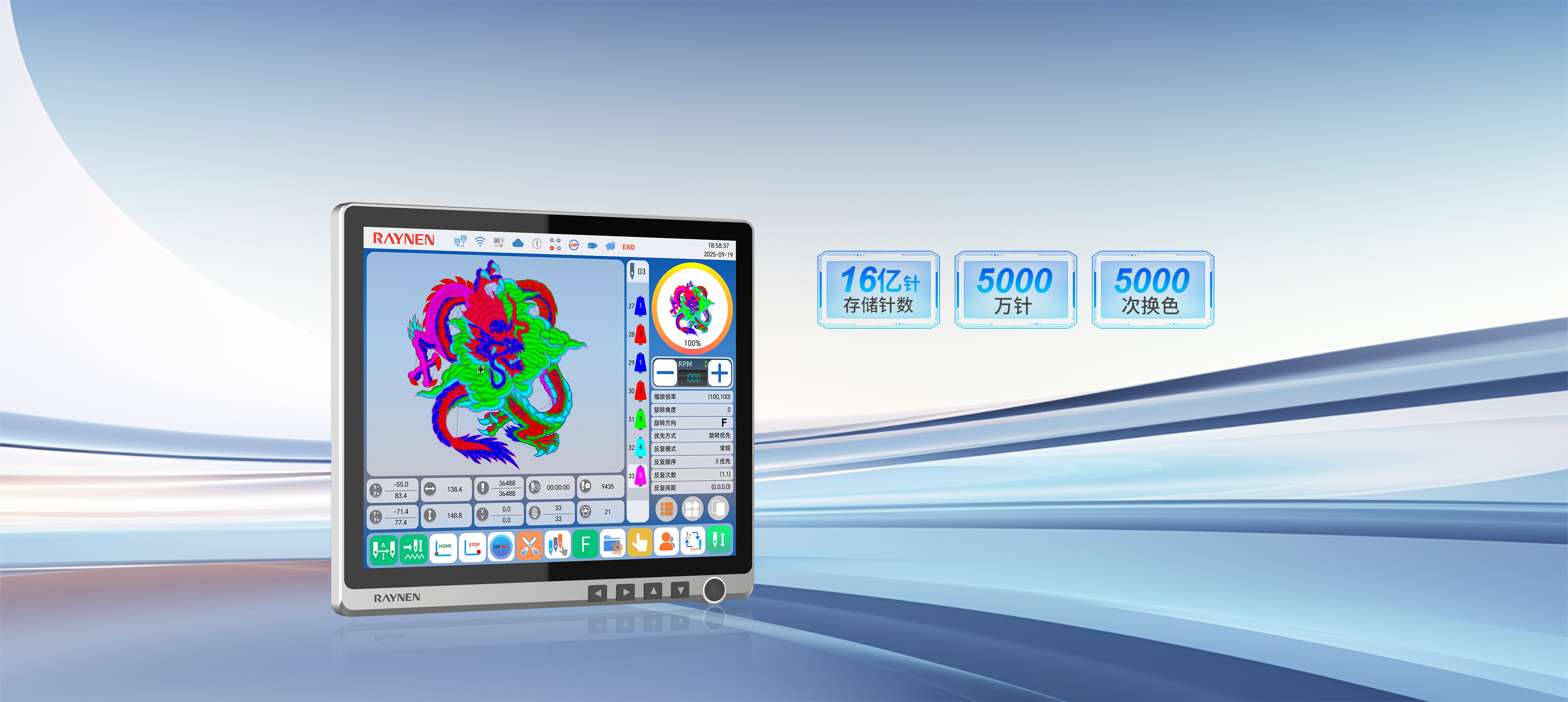 存儲針數達16億針,單個花樣可達5000萬針、5000次換色