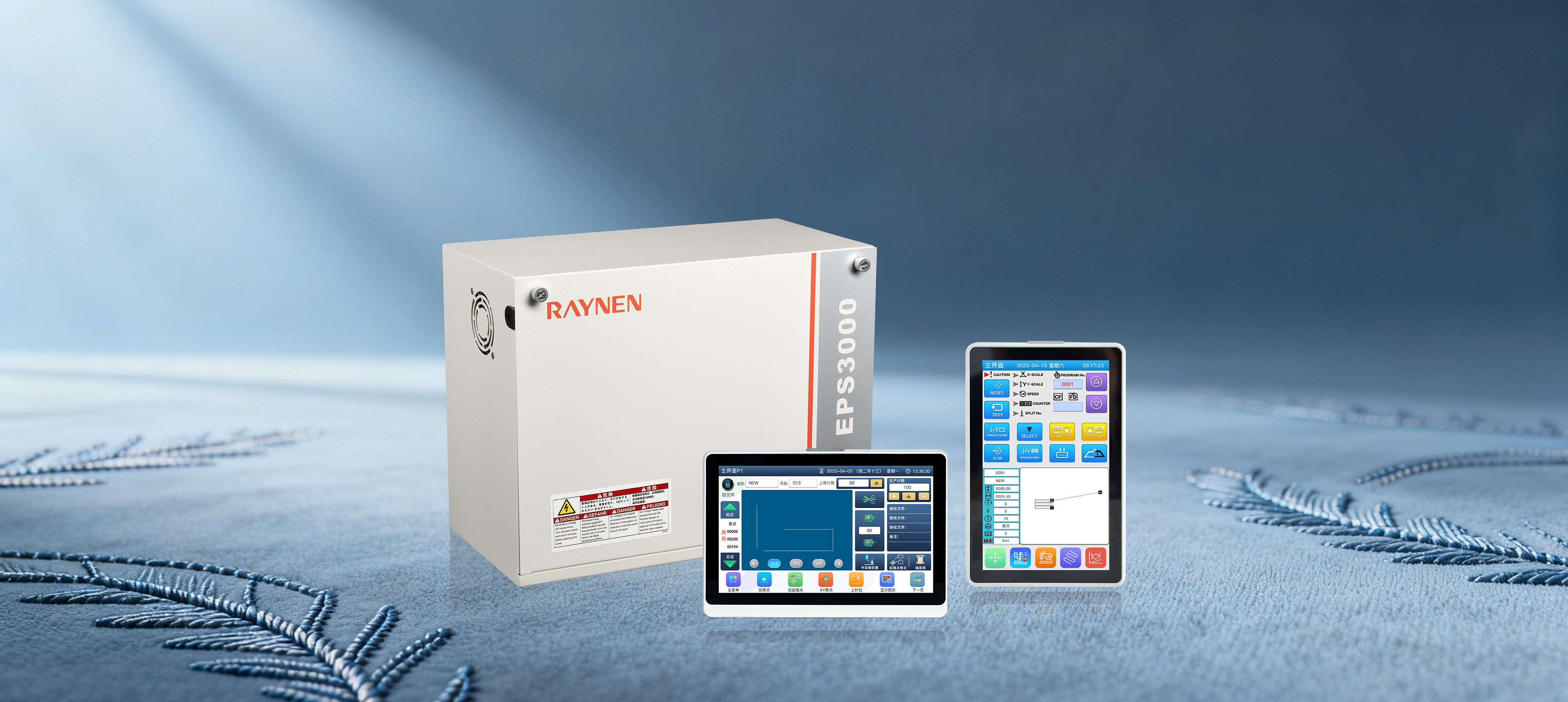 電腦花樣機控制系統的組成包含:750W主軸伺服電機和驅動、86閉環步進電機的XY框驅動、主控箱、操作盒、針桿定位檢測裝置、設定開關和腳踏檢測裝置、RFID模塊和激光切割裝置(選配)等。通過電網輸入轉化為控制系統內部的各種工作電壓,實現圖形花樣的自動縫制,其動作包含:主軸的變速運行與定位起停,框架運動軌跡的跟蹤與控制,系統多信息融合的協調控制,花樣的綜合顯示管理與預處理,各種機械部件的優化驅動,管控一體化的調度等等,最終實現各種各樣花版圖形的高效完美的縫制加工。