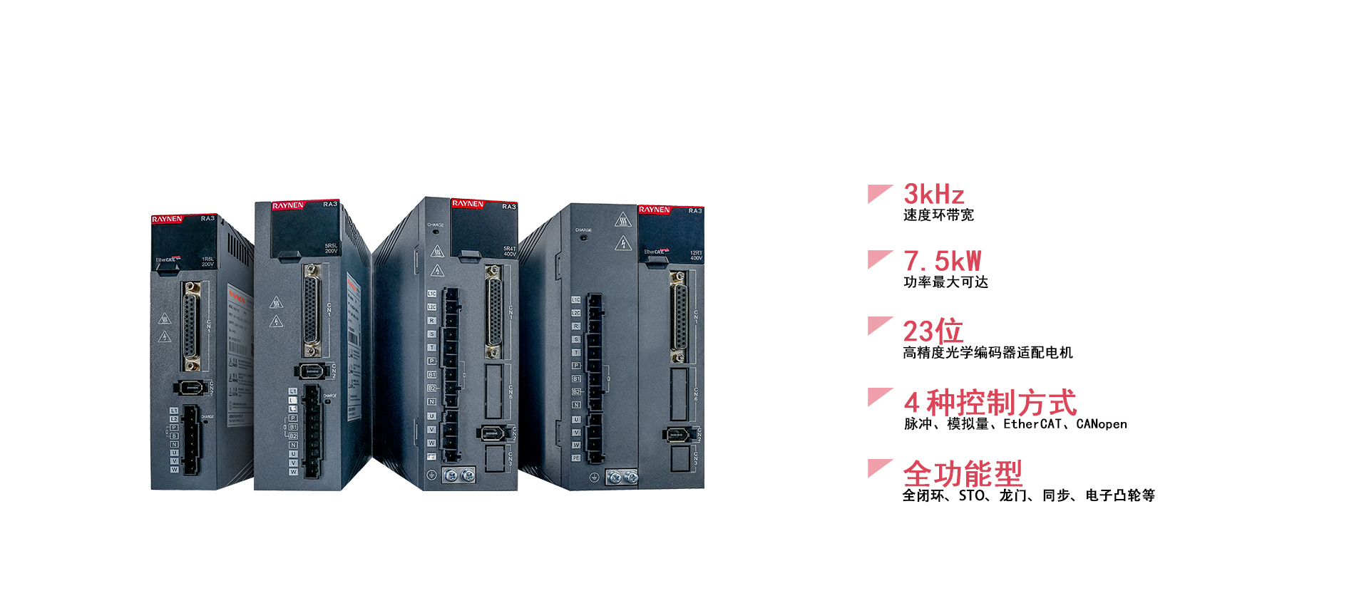 RA3系列全功能型伺服驅動器是睿能科技依托第三代研發技術平臺打造的全新伺服產品,具備高精度、高響應、高防護等特點,廣泛適用于機器人、鋰電、電子設備、紡織、包裝、機床和木工等行業,顯著提高機械設備生產效率。
